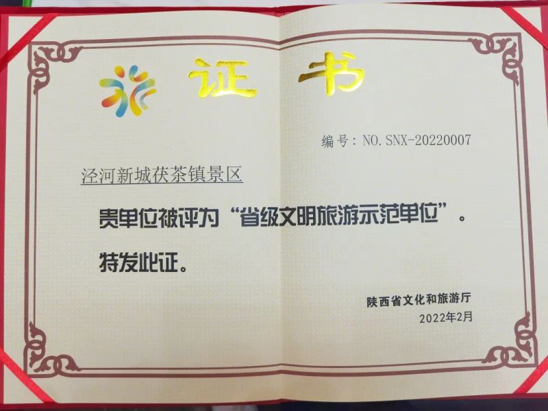 4月29日,在陕西省委精神文明建设指导委员会办公室、陕西省文化和旅游厅主办的2022年陕西省文明旅游启动仪式上,西咸新区泾河新城茯茶镇景区被评为“陕西省文明旅游示范单位”,并获授牌。
