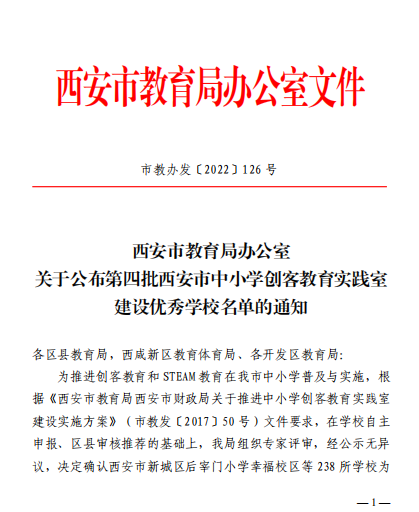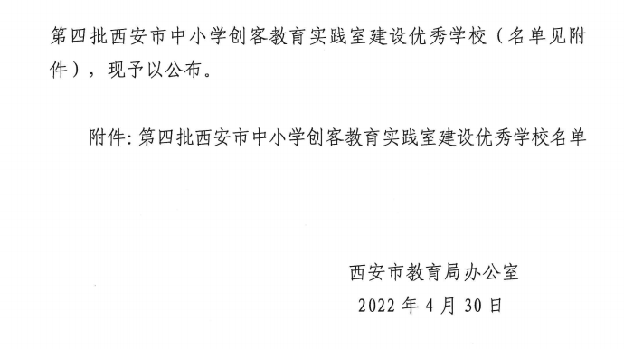 为推进创客教育和STEAM教育在我市中小学普及与实施,近日,西安市教育局办公室下发《西安市教育局办公室关于公布第四批西安市中小学创客教育实践室建设优秀学校名单的通知》文件,西咸新区泾河新城第二学校和西咸新区泾河新城第三学校被评为“第四批西安市中小学创客教育实践室建设优秀学校”。