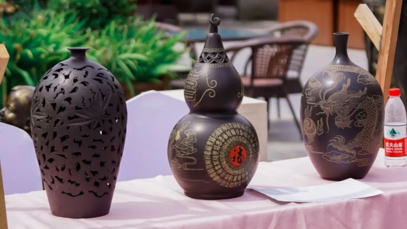 其中,省级非物质文化遗产五陵塬黑陶,以黄河流域红胶泥为原料,由泥粒子分化到一次成型要经过20几道工序,采用独特的炭化窑变技术精制而成。“最终要运用雕、刻、镂、书、画五功为一体的综合影刻技法,经过精湛的技艺功底,雕刻出栩栩如生的图案造型,最后完成一件精美的黑陶作品。”黑陶产品传承人刘纪荣介绍道。