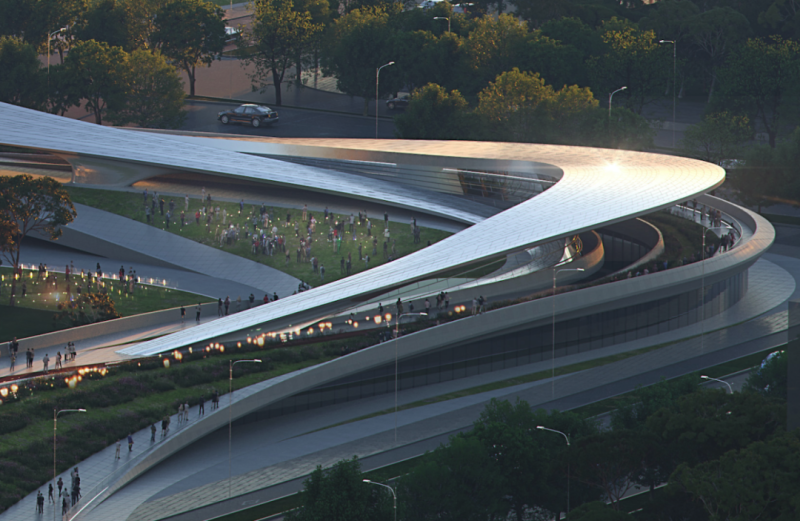 内部缓缓倾斜的坡道为高架公共步行网络提供了入口。建筑体量在城市中蜿蜒穿梭,巧妙的动线为商业和住宅区同南部规划的公园、河流建立连接,将城市居民引向建筑的中心,还与规划中的轨道交通车站直接相连。