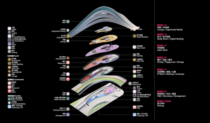 项目地处泾河新城核心的泾河湾院士科创区板块,以泾河大道为界,分南北两个大的功能组团。其中,北侧以图书馆为核心功能,包括图书阅览售卖、文化艺术观影、商贸等配套功能;南侧突出现代文化艺术展示与交流功能,同时涵盖剧院演出、艺术科教等职能。