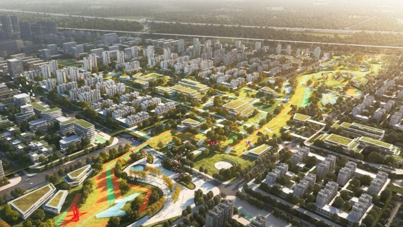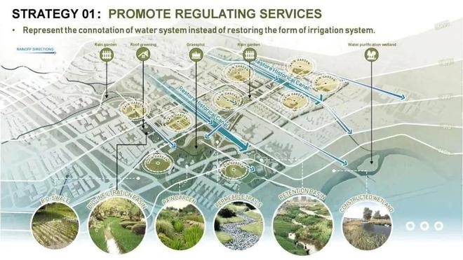 崇文塔片区位于西安北部,是关中平原山水结构上的关键节点,基地内地形平坦、河渠纵横。世界灌溉遗产郑国渠流经此处,带来了万顷良田并缓解了泾河洪水泛滥的问题。然而,在周边地区快速城镇化的过程中,崇文塔片区原有的生态环境和水文环境不断遭到侵蚀,并由此引发了水系灭失、生物多样性降低、生态调节功能退化等一系列问题。为此,北京清华同衡规划设计团队从城市规划、景观设计、碳减排等多角度出发,提出了恢复水系调节能力、提升生态系统服务功能、增加碳汇能力,丰富生态多样性等四大解决方案,探索了在地化的生态友好型发展模式。