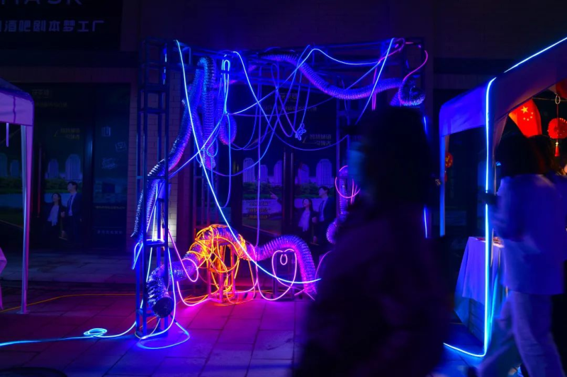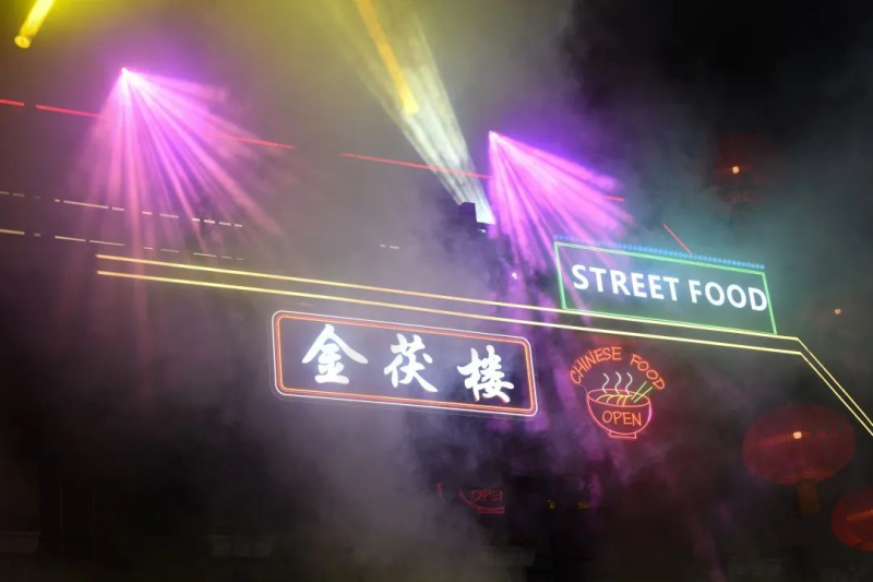 硕大的金花圣像穿越时空而来,无序的复古街头霓虹闪烁、光束交杂、烟雾四起,氛围感瞬间拉满,每一处都是绝佳打卡点,随手一拍即成大片。