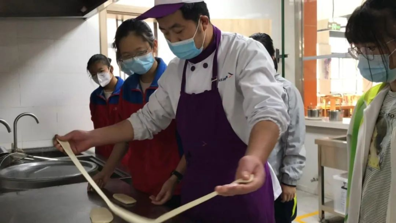 后厨厨艺教学中,扯面师傅手把手带着孩子们制作扯面;