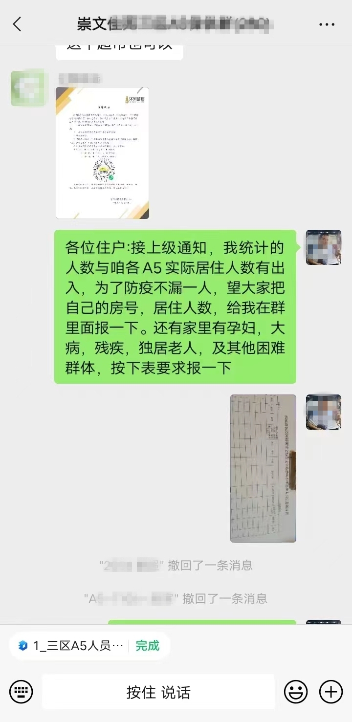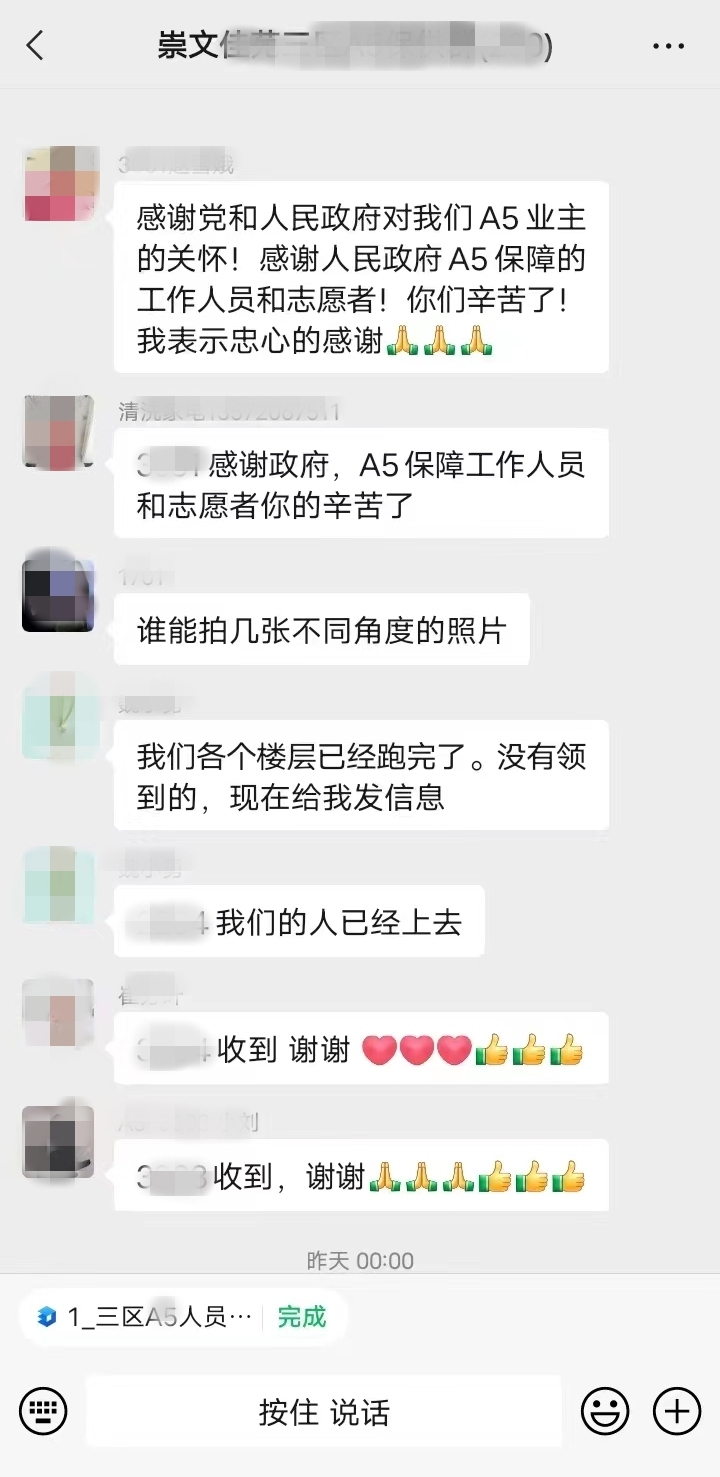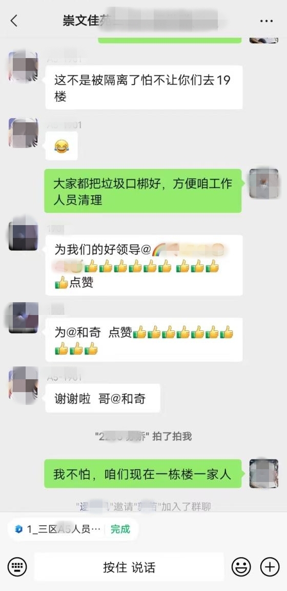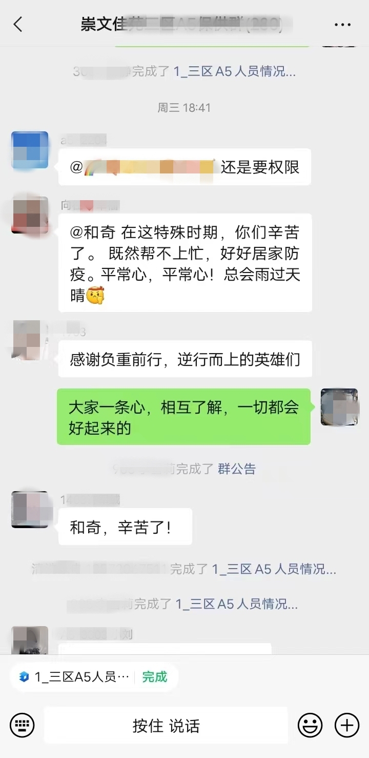 “可靠、有爱、积极、细心、及时……”这些词,都是群众贴在和琪身上的“标签”。在崇文佳苑三社区A5保供群里,居民们不断地夸赞他。和琪在后面跟了一句话:“我不怕,咱们现在是一栋楼一家人!”