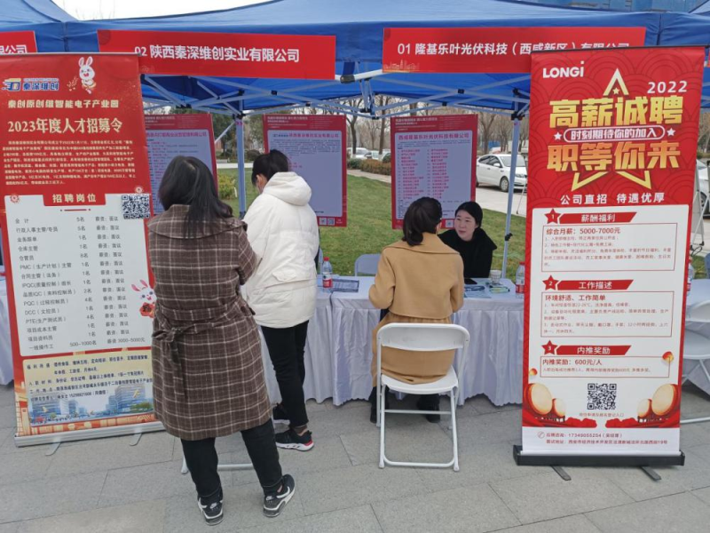 招聘会现场,隆基乐叶光伏科技(西咸新区)有限公司、陕西法士特沃克齿轮有限公司、陕西新银海电气有限公司、陕西好邦食品有限公司、陕西恒生乳业有限公司等20余家用人单位参与招聘,招聘需求3000余人。