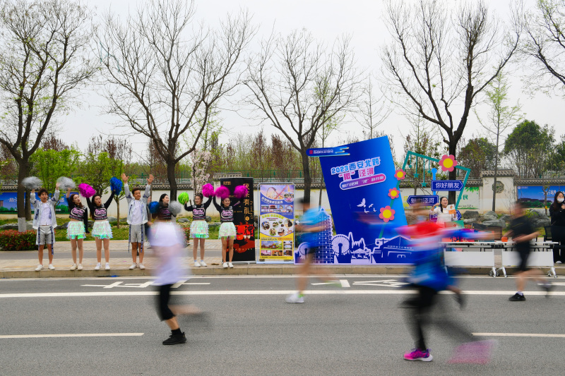 在赛事开始的第15分钟,泾河新城文化补给站迎来第一波参赛选手。伴随着节奏动感的鼓乐,8名来自泾河新城乐华城的拉拉队员热情起舞,为参赛选手加油助阵,也为本场比赛增添青春活力。