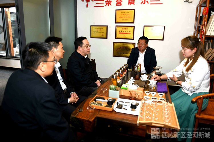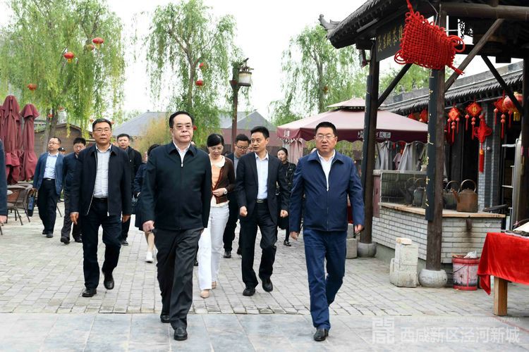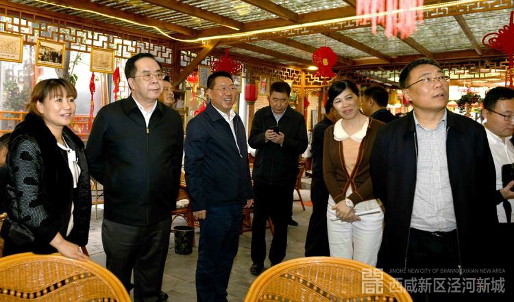 茯茶镇里小桥流水、灯笼高悬,戏楼、茶香、秦腔,游人如织呈现出一派繁盛红火景象。韩东太一行边走边看,详细听取西咸新区泾河新城创新城市发展战略定位和思路。