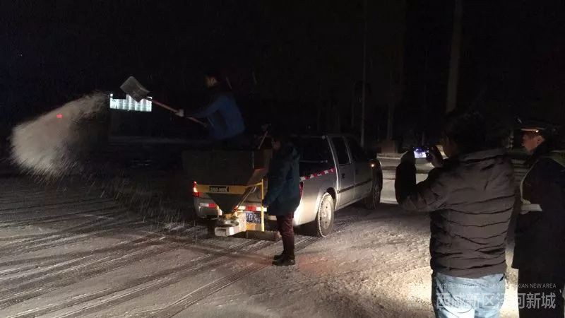 降雪后,城乡管理局立即启动应急预案,按照公共场所优先,繁华道路优先,主干道优先的原则,负责组织人员在辖区各道路进行撒布环保融雪剂,出动机械设备连夜除雪,确保主干道路、医院、学校、商场、农贸市场周边以及公共厕所周边等“民生”通道畅通。