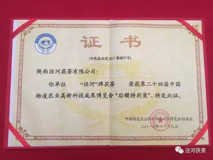本次大会共有十余家茯茶企业向“后稷特别奖”、“后稷奖”发起冲击,其中三家企业入围“后稷奖”。 值得庆贺的是,泾河茯茶是本届农高会上唯一茯茶企业“后稷特别奖”获得者。