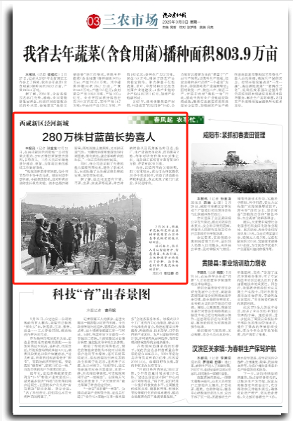 本报讯(记者 孙金龙)2月21日,在西咸新区泾河新城一公司育苗大棚内,280万株甘蓝苗整齐排列,长势喜人。工作人员正忙碌地进行选苗、整苗,为即将到来的移栽工作做好准备。