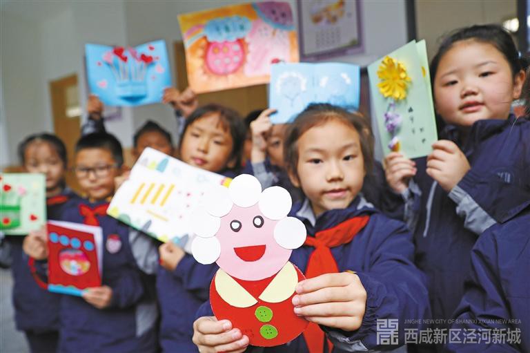 10月14日,泾河新城第二学校二年级学生展示手工作业作品。