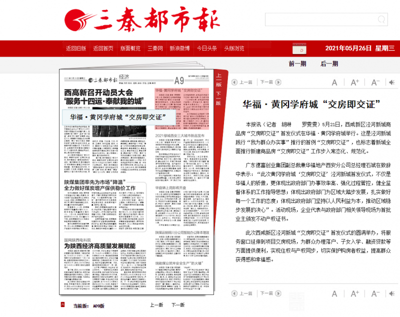 本报讯(记者 胡琳 罗雯雯)5月21日,西咸新区泾河新城商品房“交房即交证”首发仪式在华福·黄冈学府城举行。这是泾河新城践行“我为群众办实事”推行的首例“交房即交证”,也标志着新城全面推行新建商品房“交房即交证”工作步入常态化、规范化。