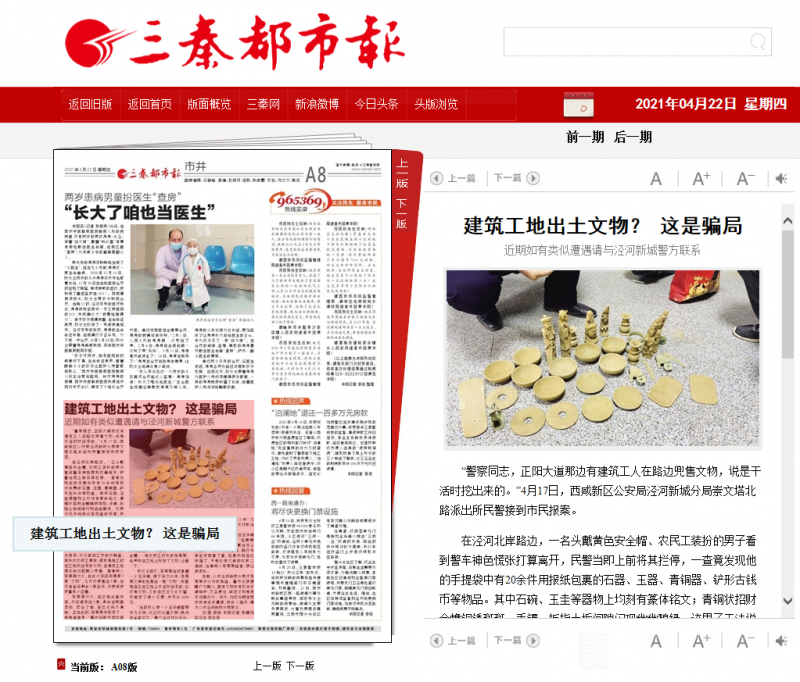 “警察同志,正阳大道那边有建筑工人在路边兜售文物,说是干活时挖出来的。”4月17日,西咸新区公安局泾河新城分局崇文塔北路派出所民警接到市民报案。