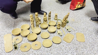 在泾河北岸路边,一名头戴黄色安全帽、农民工装扮的男子看到警车神色慌张打算离开,民警当即上前将其拦停,一查竟发现他的手提袋中有20余件用报纸包裹的石器、玉器、青铜器、铲形古钱币等物品。其中石碗、玉圭等器物上均刻有篆体铭文;青铜状招财金蟾铜锈斑斑;手镯、扳指土垢间隙闪现幽幽碧绿。该男子无法说明这些物品的来源,民警遂将其带回公安机关做进一步调查。