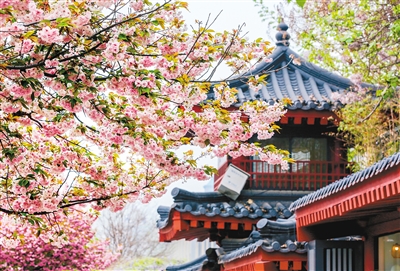 近日来,雁塔西路上的樱花花开正盛,与附近古色古香的建筑楼群相映成趣,宛如铺开了一幅美丽的画卷。 (记者 雷伟东 摄)