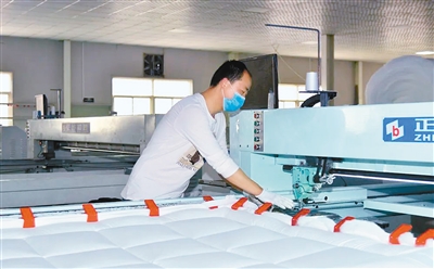 走进该公司生产车间,工人们戴着口罩各司其职,一派忙碌景象。绗缝车间里,一位身穿白色T恤的小伙正在机器前娴熟地加工被子。他是泾河新城泾干街道双赵村北组村民高帅,已在这里工作两年,是厂里业务骨干。进厂前,他在广东打工,哥哥患重病后,为照顾老人和哥哥,他回了乡。一时间,没了固定收入,加之哥哥高额的治疗费用和日常必需的生活开支,家庭成了返贫户。