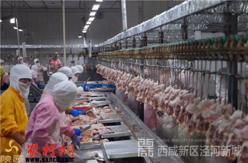 在位于西咸新区泾河新城的陕西泾河好邦食品有限公司内,工人们正在生产线上进行鸡肉包装。据了解,该企业拥有1条日加工6万羽白羽肉鸡分割生产线,年可加工白羽肉鸡1700万羽,年产值达3亿元,供应的鸡肉产品约占西安市场总需求量的70%。