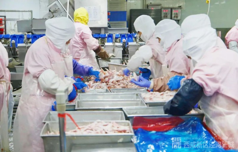 在位于西咸新区泾河新城的陕西泾河好邦食品有限公司内,工人们正在生产线上进行鸡肉包装。据了解,该企业拥有1条日加工6万羽白羽肉鸡分割生产线,年可加工白羽肉鸡1700万羽,年产值达3亿元,供应的鸡肉产品约占西安市场总需求量的70%。