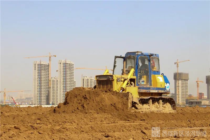 在沣泾大道茶马大道现场,大型机械隆隆作响,装载车量往来穿梭,工人正在紧张有序地施工作业。