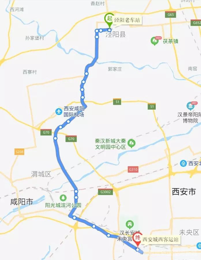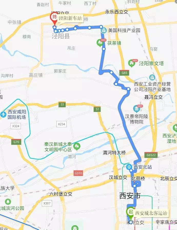 泾西1号线:泾阳新车站、泾干中学、郑国广场、泾永路、茶马大道、泾河乐华欢乐世界、秦汉大道、兴隆路、建元路、西安北站、凤北路、文景路、西安城北客运站;
