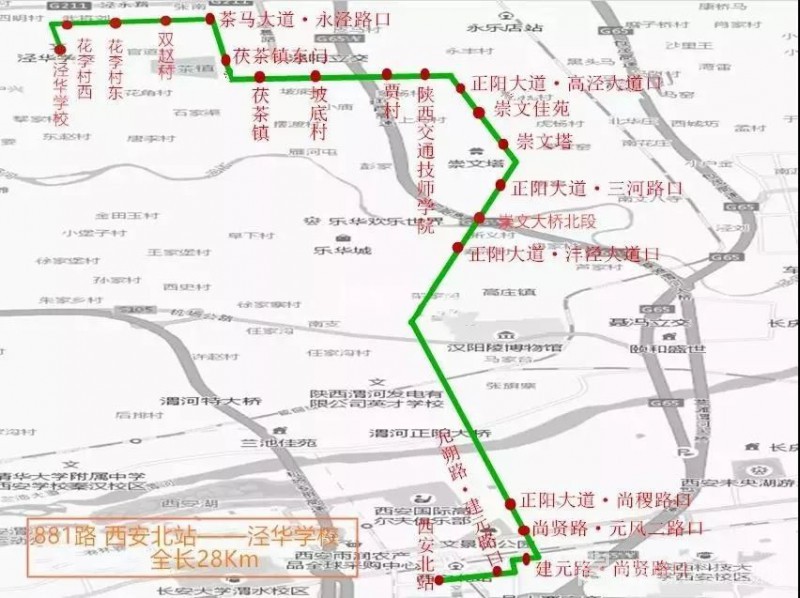 881路:茯茶镇至西安北客站(茯茶镇、坡底村、贾村、陕西交通技术学院、正阳大道、崇文佳苑、正阳大道、尚稷路、尚贤路、建元路、西安北客站);