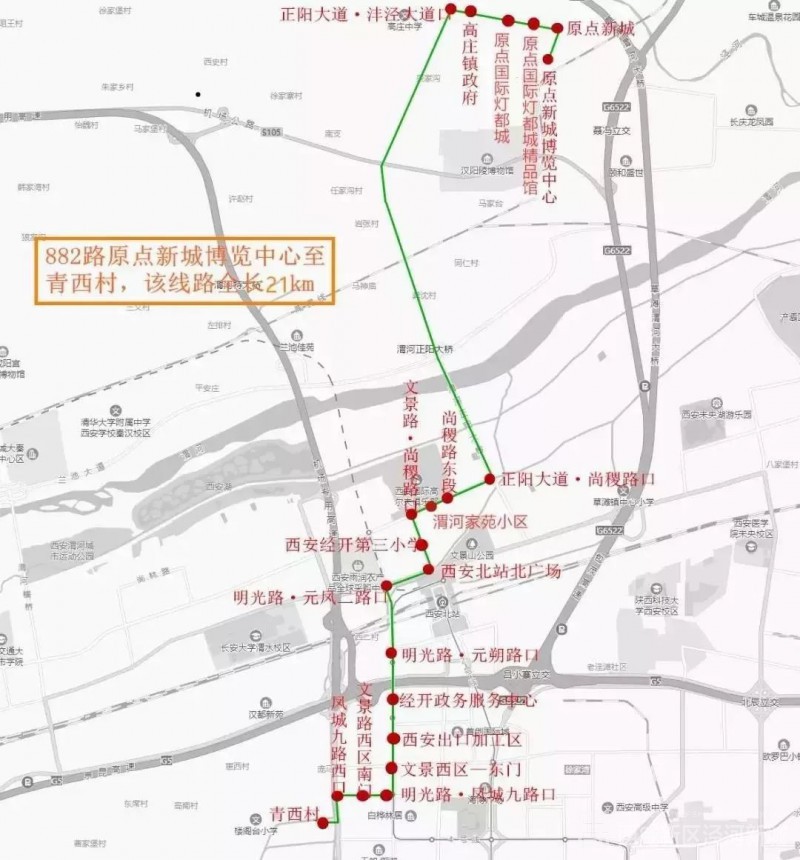 882路:原点新城博览中心至西安市青西村(原点新城博览中心、原点新城、原点国际灯都城精品馆、原点国际灯都城、高庄镇政府、正阳大道·沣泾大道口、正阳大道·尚稷路口、尚稷路东段、渭河家苑校区、文景路·尚稷路口、西安经开第三小学、西安北站北广场、明光路·元凤二路口、明光路·元朔路口、经开政务服务中心、西安出口加工区、文景西区东门、明光路·凤城九路口、文景路西区南门、凤城九路西口、青西村);