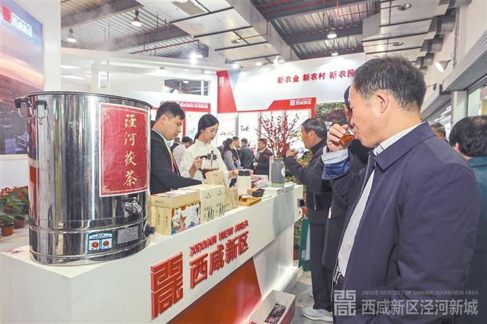 人们正在第二十六届中国杨凌农业高新科技成果博览会西咸新区展台前品尝泾河茯茶。