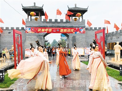 国庆长假期间,西咸新区泾河新城茯茶镇在四海同歌、普天同庆的时刻为游客奉上了一道道国庆七天乐游大餐,除了品味茯茶与丝路特色美食外,茯茶镇国庆七天系列活动不重样,为游客带来视觉与味觉的双重享受。图为优美的古典舞蹈《丽人行》吸引了众多游客观看。