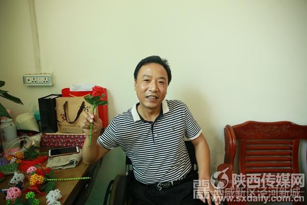 日子走上正轨,刘猛也重燃希望。坐在轮椅上的他承担起了家务活,买了三轮摩托车接送孩子。闲暇之余,他跟泾河新城扶贫办专门为他请的老师学起了手工制作,学了一个月后,他的桌上摆满了用串珠编成的兔子、蜻蜓、玫瑰等小物件。刘猛笑着说:“我喜欢这个玫瑰花,老师说赠人玫瑰,手有余香。”大家都说他心态好,每次去见刘猛都是乐呵呵的,他说就是穷开心,人要向前看。
