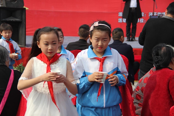 会后,双赵村所有65岁以上的老人围坐共品重阳百寿宴。村小学少先队员们向老人们敬茶,引来阵阵掌声。村中特色茶馆也纷纷响应号召,重阳节免费为老人提供招待用茶,获得村民及游客广泛好评。