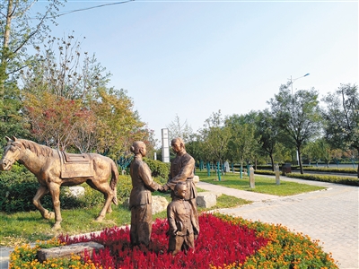 走在茶马大道上,一组组茶马主题雕塑,让人感受到浓郁的文化气息。准备妥当、告别亲人准备沿着丝路向西域进发的商帮驼队;栩栩如生驮运茯茶的马队;抵达目的地后卸货销售的场景……一幅幅生动的场景,系统地展示了当年陕西商帮从出发前整理货物、检查马匹装备、与家人作别、沿途休息到抵达目的地进行茶马互市交易等诸多内容。在绿树掩映下,这些雕塑更加得富有生活气息,也成了游客拍照合影的青睐之作。