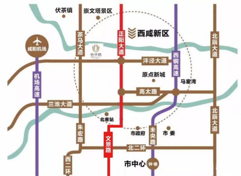 4、西安北站—原点新城:站前广场→元朔路→建元路→尚稷路→正阳大道→沣泾大道(向东)→原点新城。