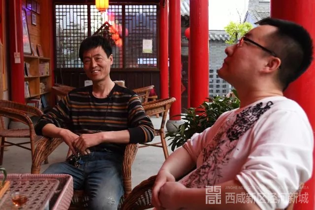 泾阳县泾干镇双赵村村民石新顺(右二)在自家农家院改造而成的茶馆中与客人聊天。(3月29日摄)
