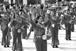 106名女子队敲锣打鼓,喜笑颜开;10人旗袍队款款走来,轻歌曼舞;4组农民扁担挑起瓜果蔬菜,喜气洋洋;40人迎亲队伍吹吹打打,欢天喜地……这17支都超过百人的比赛队伍各有特色,年龄普遍在四五十岁,有一些花白头发的七旬老人在队伍中又敲又跳,也是神采奕奕,赢得观众阵阵掌声。