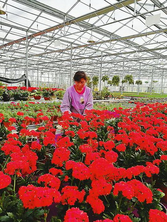“目前,我们园区固定聘用的职业农民有60人,每人每月能挣3000元。到了忙碌时节,还会从周边村子雇用临时工,多的时候近400人。为了带动村民一起发展,我们正在和周边村子洽谈,通过‘龙头企业+合作社+农户’的方式,将花卉种植延伸到村民中去。”郭丽娜说。