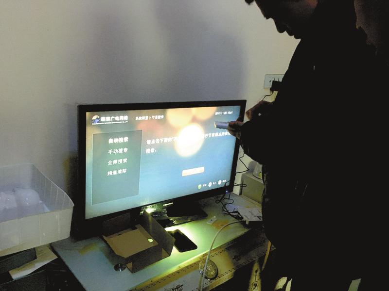 工作人员在贫困户家里调试有线电视