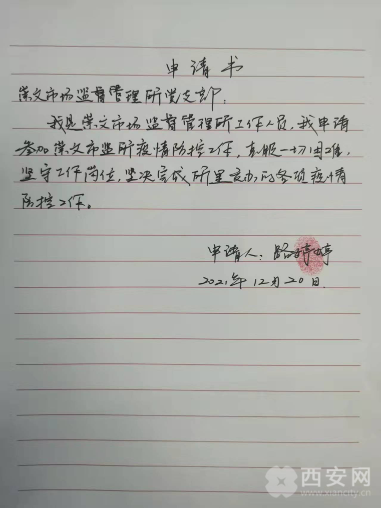 “我申请留下来值班,与其他党员干部一起到辖区指导检查疫情防控工作”。一封申请到疫情防控一线的请战申请书递交到了西咸新区市场监督管理局泾河新城分局崇文市场监督管理所党支部书记张彤彤手里。递交这份请战书的是崇文市场监督管理所干部路婷婷,当得知西安市要开启城市封闭化管理的消息时,她第一时间就下定决心“我要向组织靠拢,向党员干部看齐,克服困难,坚守工作岗位,坚决完成所里安排的工作”。