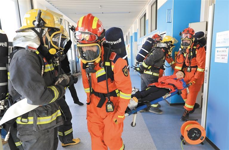 消防员正在进行灭火救人演练。