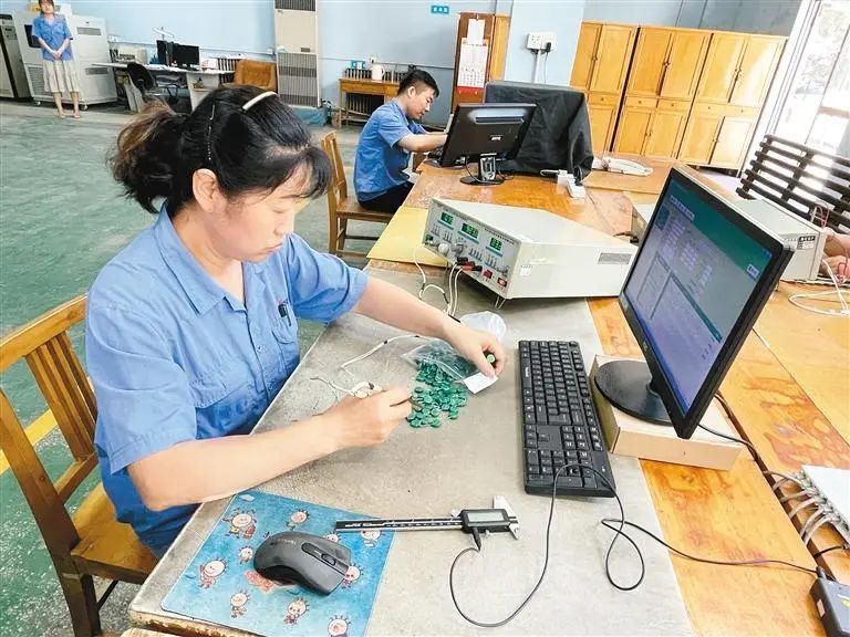 走进生产车间,笔者看到流水线上正加工生产着绿色的压敏电阻,借助传送纸带,排列整齐的银色芯片经过自动化设备的加工变成绿色的成品。