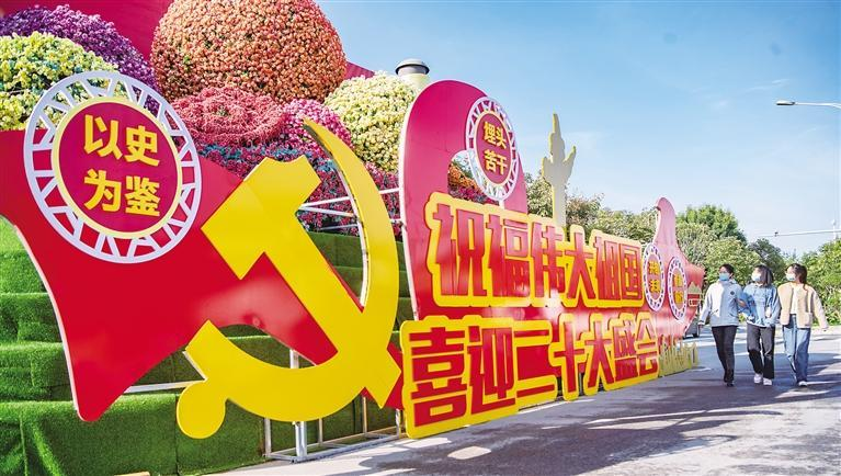 10月10日,在西咸新区泾河新城泾河大道,市民观赏“喜迎二十大”主题街景。近日,在西咸新区泾河新城,“祝福伟大祖国 喜迎二十大盛会”主题花坛纷纷亮相,为党的二十大胜利召开营造良好氛围。