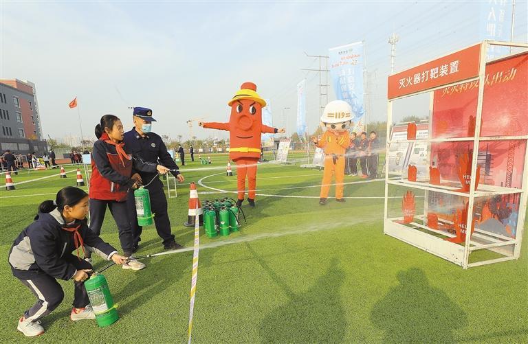 11月17日,学生正在体验灭火器打靶。当日,西咸新区消防救援支队泾河新城大队在泾河新城第二学校开展“炫出蓝焰精彩 共筑平安校园”消防科普安全进校园活动。学生们通过学习消防安全知识,进一步增强了消防安全意识和自防自救能力。