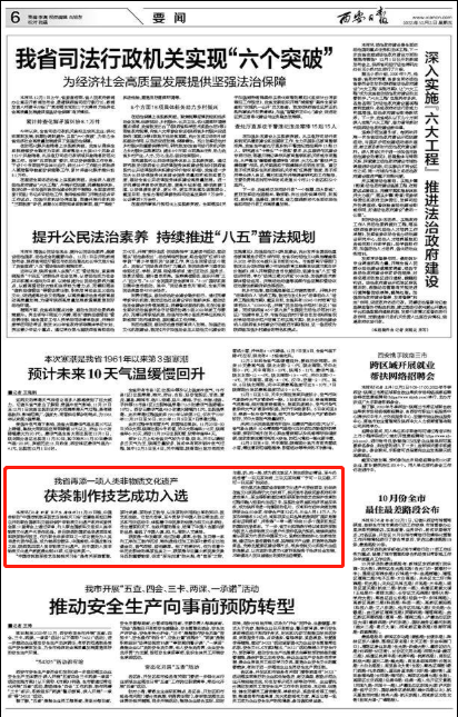 作为第五批国家级非物质文化遗产代表性项目,近年来在省文化和旅游厅大力扶持下,相关地市各级党委政府和非遗传承人、茶企等积极推动咸阳茯茶制作技艺在保护传承的过程中融入到现代生活之中,实现社会效益和经济效益双丰收,成为陕西非遗一张靓丽的名片。仅咸阳市近年来便发展茯茶企业60余家,年综合产值32亿元,从业人员1.8万人,为茶农年增收3.2亿元,咸阳茯茶公共品牌更是荣获“国家地理标志证明商标”,并取得“一带一路”沿线10多个国家和地区的国际注册商标。下一步,省文化和旅游厅将以咸阳茯茶制作技艺入选非物质文化遗产代表作名录为契机,继续深度挖掘以茯茶为代表的中国茶文化,坚持创造性转化、创新性发展,通过加大宣传营销力度、延展相关产业链,打造特色旅游商品,支持主题景区建设等方式,寻找传统文化和现代生活的连接点,让古老的非遗文化更好地服务于经济社会发展,不断满足人民日益增长的美好生活需要。