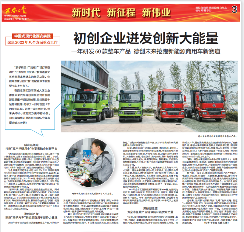 “届时,德创未来还将吸纳千余名研发骨干人才,构建包括新能源整车、电驱动、氢燃料电池系统等在内的科研创新、成果转化、科技孵化、产业聚集的科技创新全产业链生态,在西安乃至全省重卡产业链、氢能产业链强链补链过程中作出德创未来‘贡献’。”晁鹏翔说道。