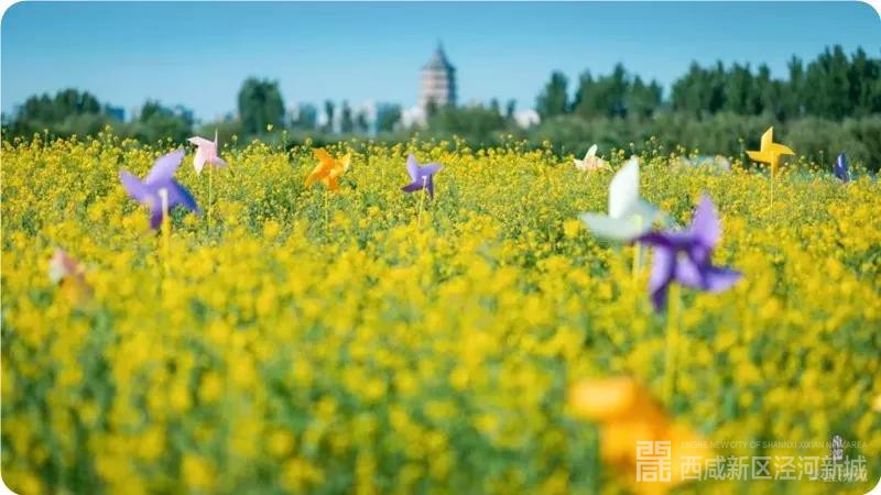 油菜花海位于泾河北岸便桥及便道两侧区域,景观打造前河滩地芦苇和蒿草等间杂生长,地形起伏较大,景观状态差,新城组织机械对杂乱地形进行修整,并播种德国速生观赏油菜。经过精心呵护,油菜花苗茁壮成长,金灿灿的油菜花交相辉映,如诗如画,让人目不暇接。