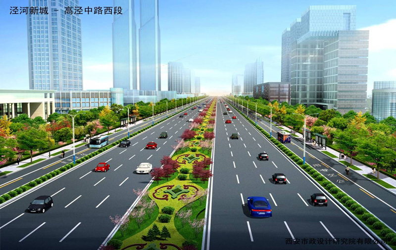 道路全长11.5公里,(泾河新城东边界-秦汉大道)红线宽60米,道路两侧绿化带各20米,双向八车道。