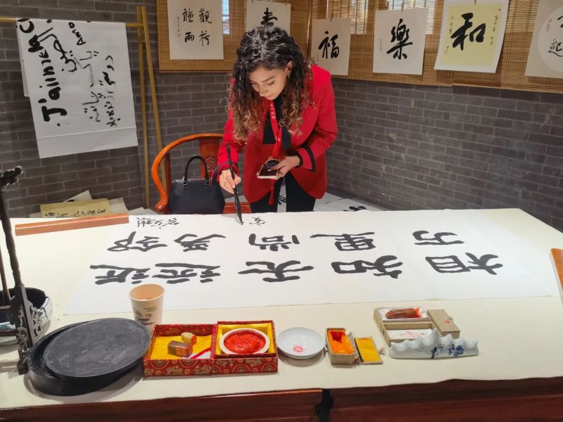 9月27日下午,在位于泾河新城茯茶镇的中国茯茶文化博物馆书法间,来自摩洛哥的安秋颖女士提起毛笔,庄重地在一幅“相知无远近,万里尚为邻”书法作品上签下了自己的名字。一起来的还有土库曼斯坦、巴基斯坦、洪都拉斯、乌兹别克斯坦等国家的留学生。在这里,他们被深厚的中国传统文化深深吸引。