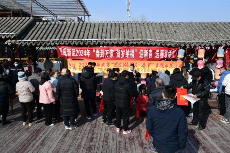 作为西咸新区“春到万家·贺岁纳福”文化文艺志愿服务的首场活动,来自西咸新区书法家协会、摄影家协会的20余名志愿者现场为景区游客和周边群众写春联、送书画、拍全家福。与此同时,陕北说书、杂技、变脸、京剧等表演轮番上演,丰盛的“非遗文化大餐”让现场群众大呼过瘾。