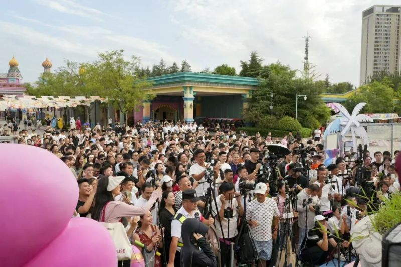 恰逢七夕,乐华城策划了花车巡游、粉色气球雨、盲盒配对交友等一系列浪漫活动,迎来了一波又一波来自各地的游客。活动现场人潮涌动,热闹非凡。广场舞台前,围满了前来观看的游客,大家都想找到一个最佳观看位置,能够跟“王婆”近距离互动。