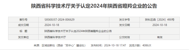 按照陕西省瞪羚企业培育认定实施方案和2024年通知要求,现将362家公示无异议的2024年陕西省瞪羚企业名单(含潜在)予以公布。请各企业联系对应初审推荐部门领取证书,详细地址及联系方式附后。